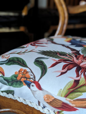 Det här eleganta stolen har fått en ny karaktär tack vare ny klädsel. Sitsen är omklädd i ett tyg med ett livfullt, exotiskt mönster. Den ursprungliga, klassiska träramen kontrasterar vackert med det färgglada tyget, vilket skapar en harmonisk komposition som passar perfekt i vintage- eller eklektiska interiörer.